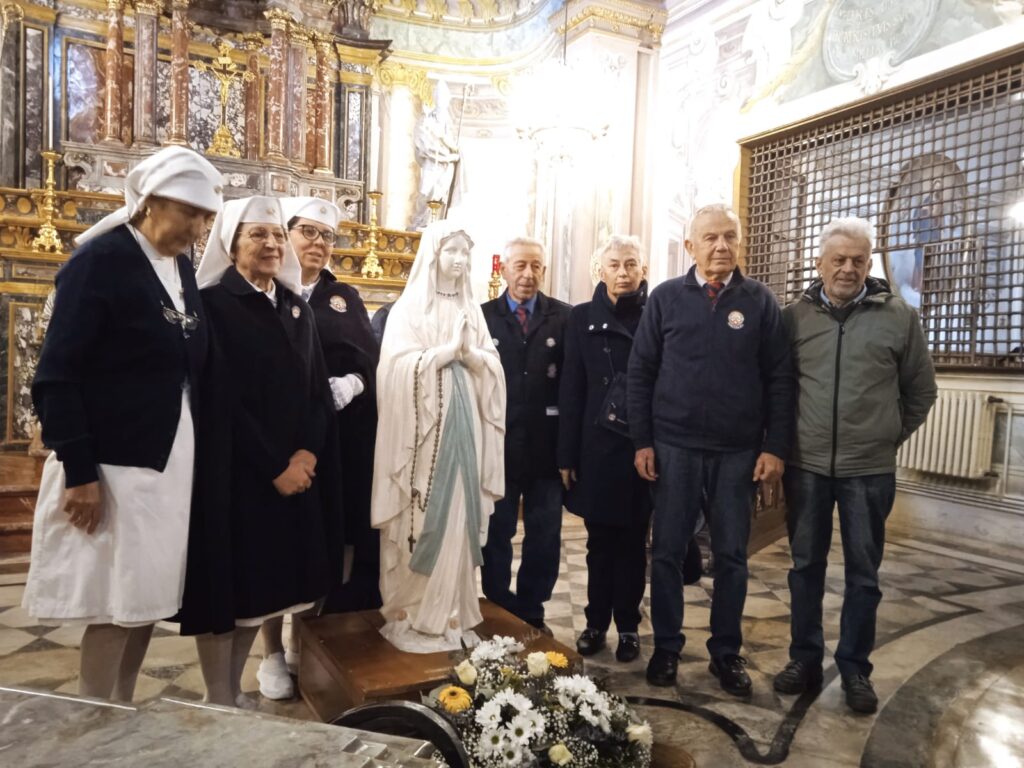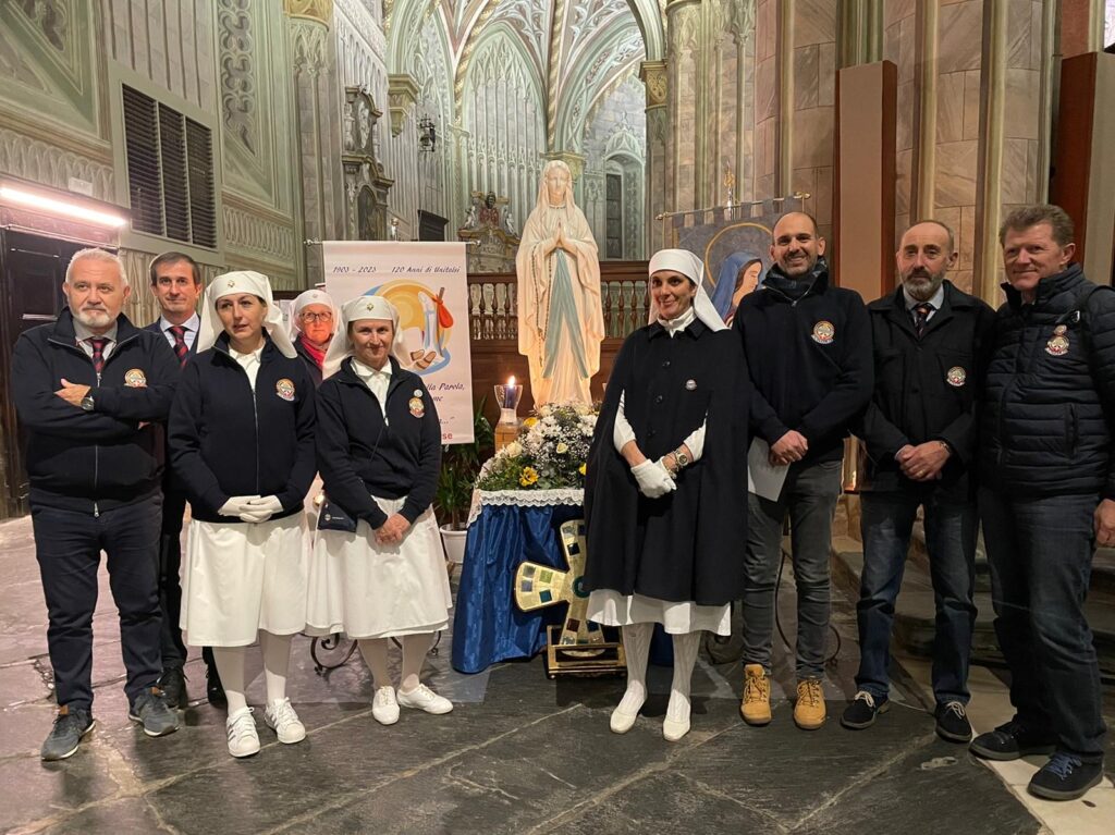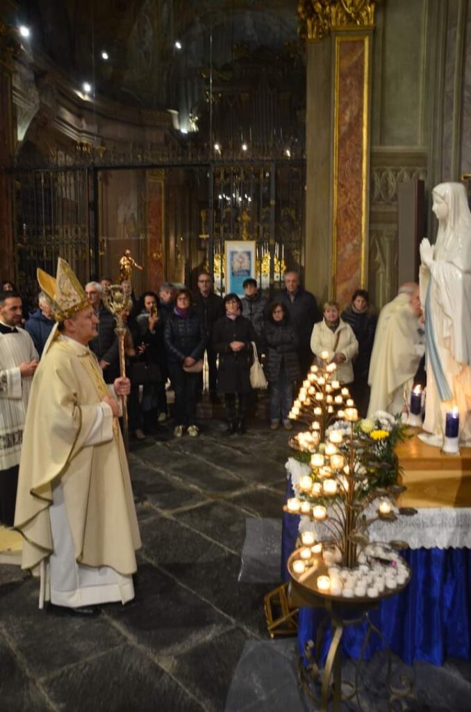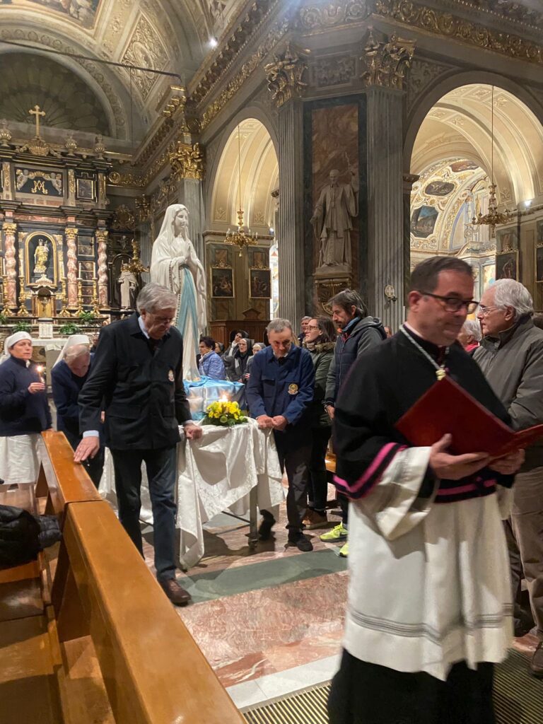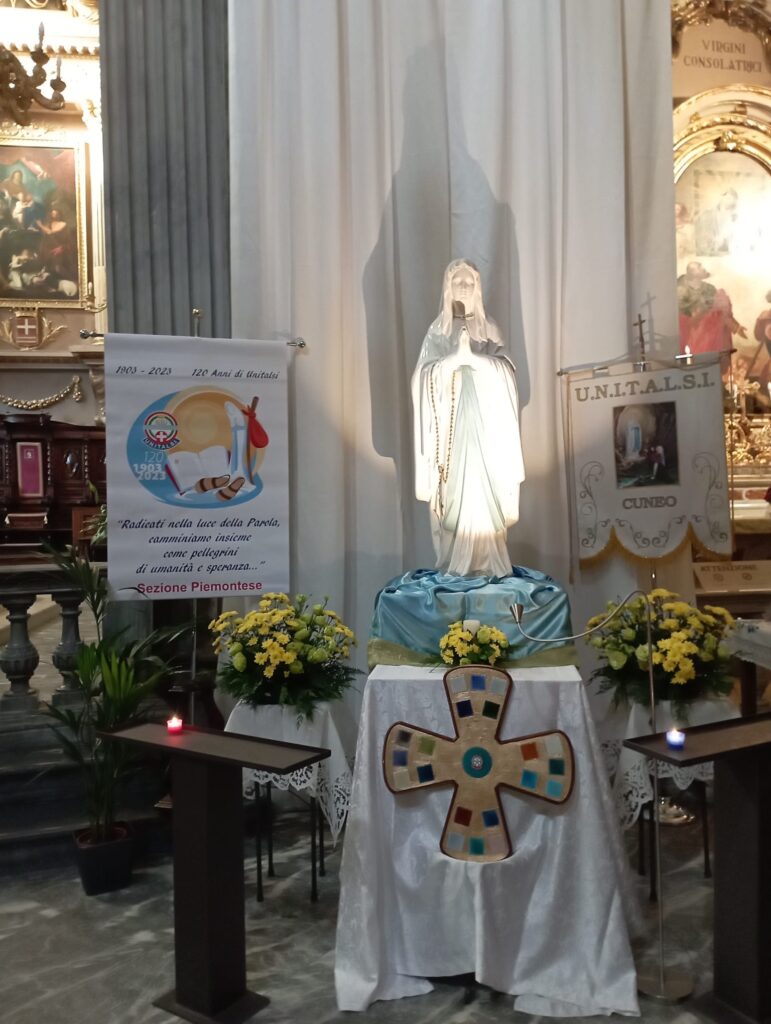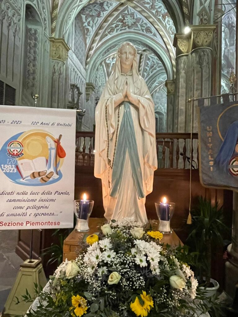 L’Effigie della Madonna Pellegrina di Lourdes è arrivata a Cuneo da Alba il 21 novembre, il Duomo gremito di fedeli ha accolto la Madonnina in devoto silenzio: Don CarloVallati, assistente Unitalsi Cuneo e vicario del vescovo per la diocesi di Cuneo/ Fossano, ha portato a tutti i saluti del vescovo, mons.Piero Delbosco, ed ha invitato a riflettere sul pellegrinaggio di Maria Bambina, condotta dai suoi genitori a servizio del tempio, dove, la tradizione racconta, vi rimase per 12 anni, ed il servizio unitalsiano che da 120 anni è la vita dell’Associazione. Don Carlo ha anche ricordato il concetto di fedeltà di fondo al carisma del cammino di un gruppo, ricordando anche l’Arma dei carabinieri che nel giorno della Virgo Fidelis rinnovano la fedeltà ad una scelta di vita. Alla sera una processione all’interno del duomo ha raccolto le speranze e le attese dei cittadini di Cuneo e dintorni.